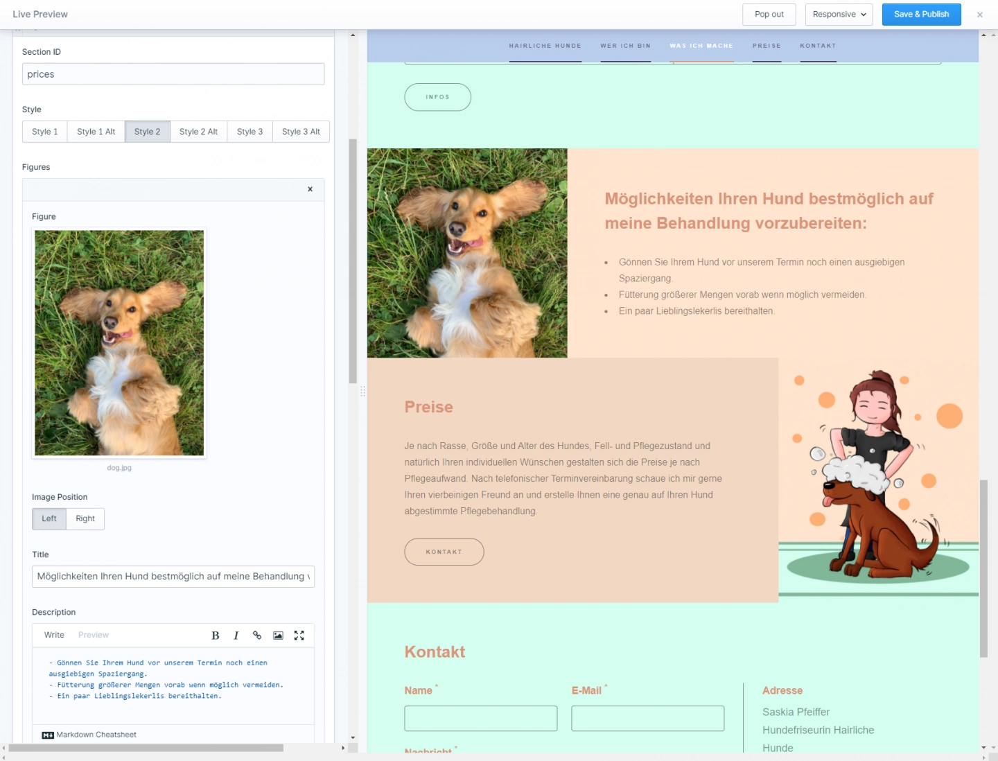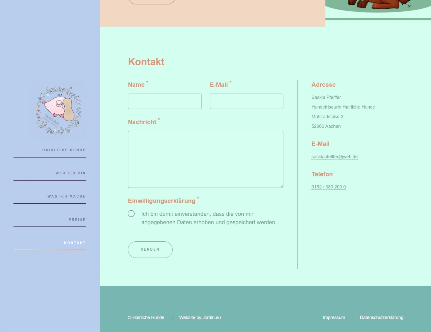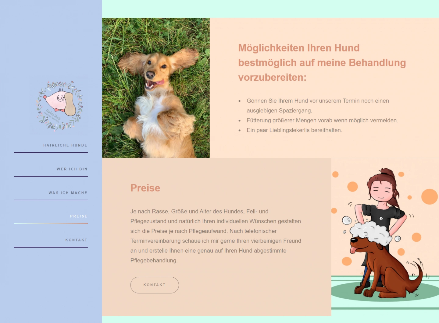 The dog groomer Saskia Pfeiffer wanted a simple website for the start of her self-employment. The focus should be on simplicity and usability. In addition to some structured information, a simple form should offer customers a quick and easy way to contact her.