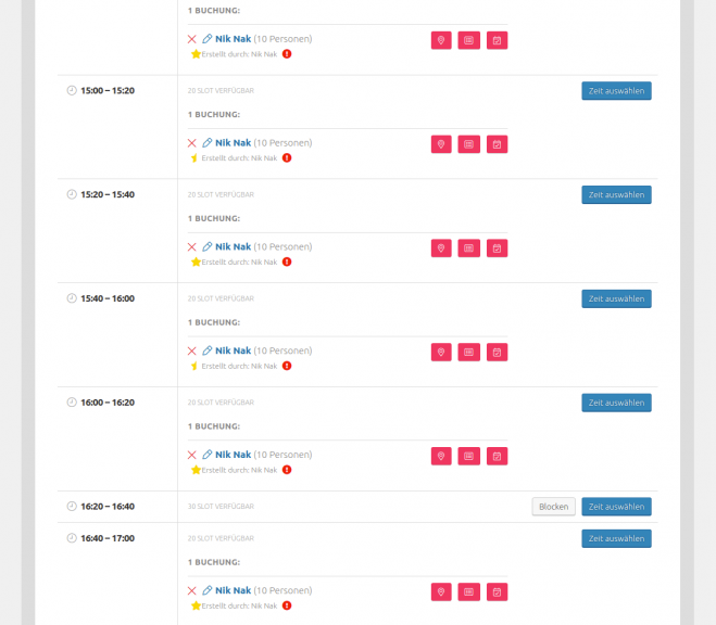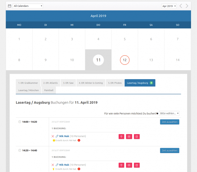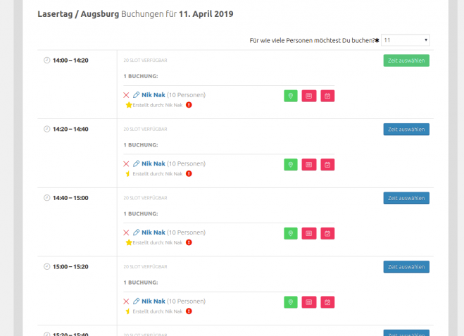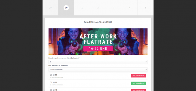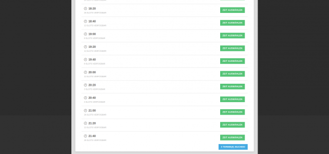 At the beginning, the visitors of the website should have the possibility to book several slots at the same time without having to book each slot individually. Subsequently, slots should be given another size unit for the number of people, which is lowered accordingly by specifying the number of people playing.
