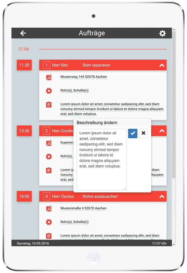 This resulted in the solution approach of a mobile application for the craft company, which should be actively used by the workers. To optimize the usability and the user experience we used the software Morea (Morae offers the possibility to test the developments in different areas. Based on the Manager, Observer and Recorder the movements and behaviors of the test persons can be recorded and evaluated) and the eye-tracker glasses "Tobii Pro Glasses 2" including the software (The saccades and the fixations of the test persons were converted as heatmap and gaze plots and matched to the surface of the prototype. This helped us to analyze the attention of the test persons and to optimize the surface accordingly).